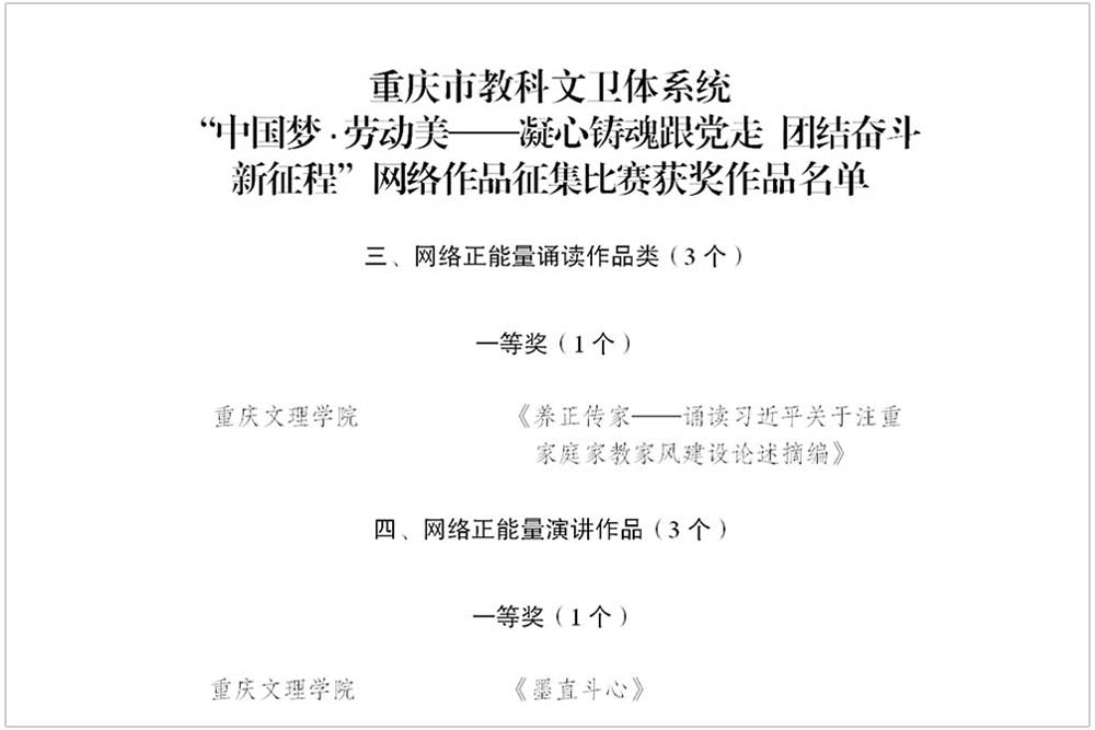 近日,由重庆市教科文卫体工会举办的“中国梦·劳动美——凝心铸魂跟党走 团结奋斗新征程”网络作品征集比赛评选结果揭晓,taptap点点马克思主义学院教师高源洁作品《养正传家——诵读习近平关于注重家庭家教家风建设论述摘编》、师范学院教师叶静作品《墨直斗心》分别荣获诵读类作品和演讲类作品一等奖。
