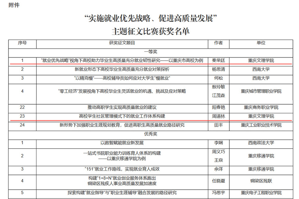 近日,重庆市人力资源和社会保障局、重庆市教育委员会公布全市“实施就业优先战略、促进高质量发展”主题征文比赛结果。taptap点点经济管理学院秦荣廷老师提交的征文《“就业优先战略”视角下高校助力毕业生高质量充分就业韧性研究——以重庆市高校为例》荣获一等奖,招生就业处周道林老师提交的征文《高校学生社区管理模式下的就业工作体系构建》荣获三等奖。
