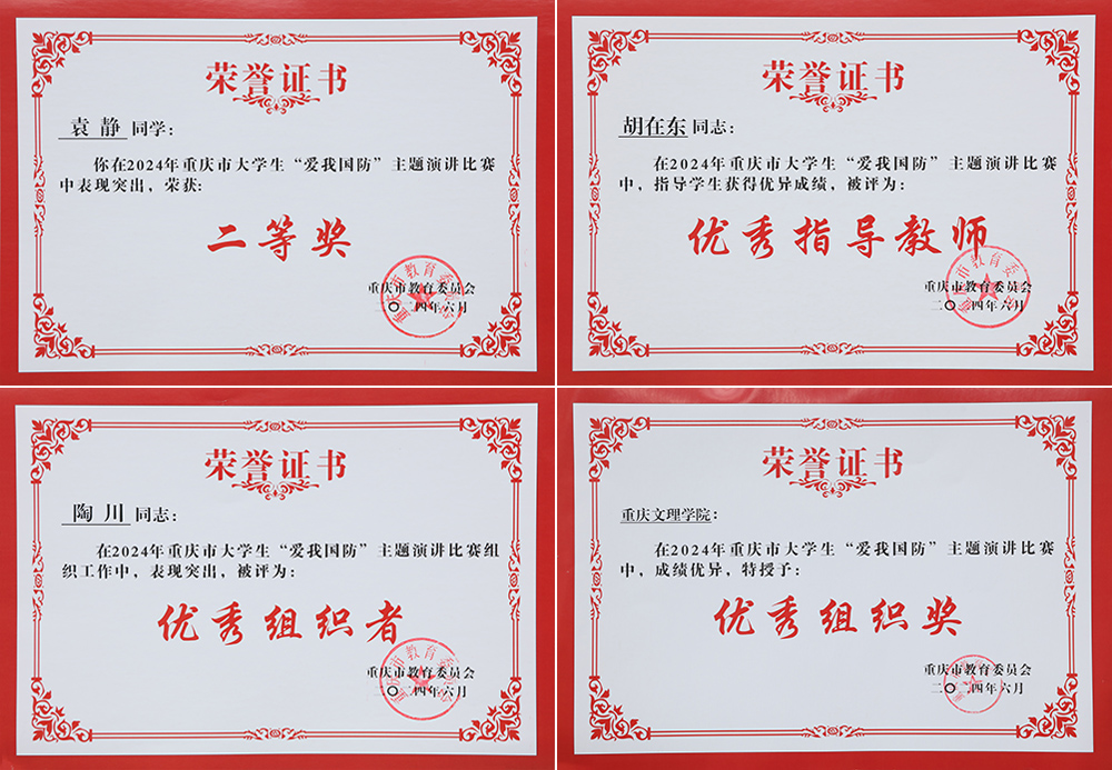 近日,重庆市教育委员会发布《关于2024年重庆市大学生“爱我国防”主题演讲比赛获奖情况的通报》(渝教体卫艺发〔2024〕7号),taptap点点师范学院2022级学生袁静荣获二等奖,胡在东荣获优秀指导老师,陶川荣获优秀组织者,学校荣获优秀组织奖。