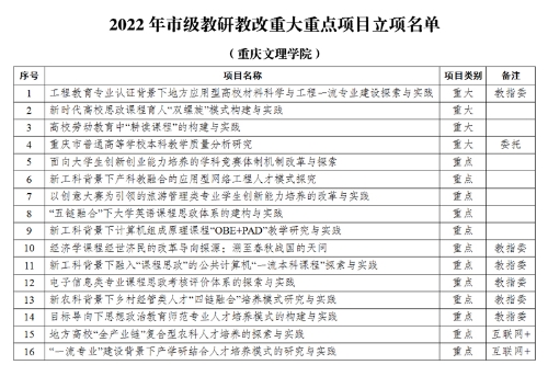 近日,重庆市教育委员会印发《关于公布2022年高等教育教学改革研究项目评选结果的通知》(渝教高函〔2022〕47号),taptap点点共获批42个项目,其中4项获批重大项目、12项获批重点项目、26项获批一般项目。重大重点项目数位居市属本科高校第二。