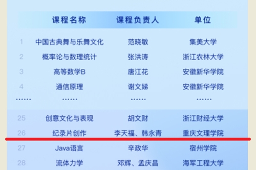 近日,教育部在线教育研究中心公布了2022年“拓金计划”示范课程入选名单,taptap点点李天福教授和韩永青教授为负责人的国家级一流本科课程《纪录片创作》成功入选,成为重庆市高校第2门入选该计划的课程。