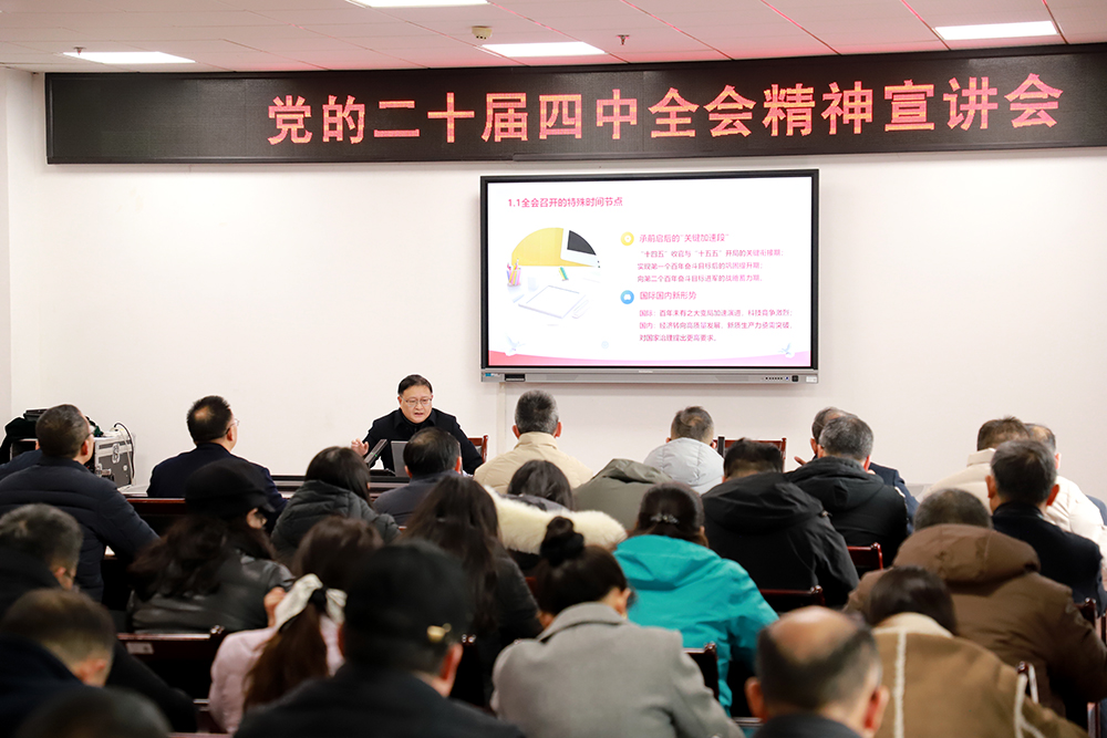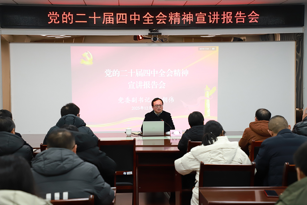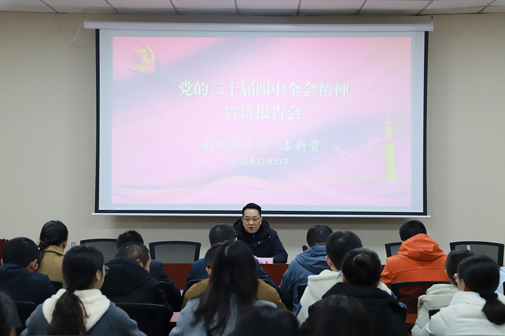 12月24日下午,学校党委副书记祝朝伟在恪勤楼623会议室宣讲党的二十届四中全会精神。