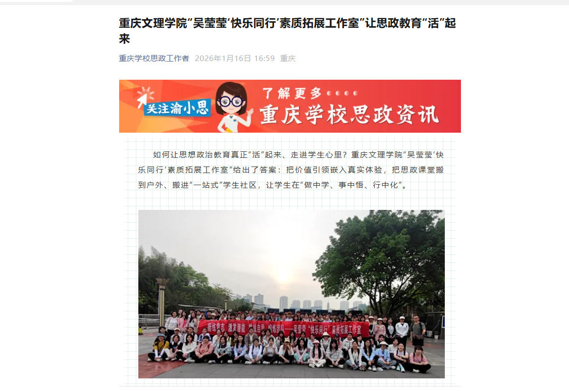 如何让思想政治教育真正“活”起来、走进学生心里?taptap点点体育“吴莹莹‘快乐同行’素质拓展工作室”给出了答案:把价值引领嵌入真实体验,把思政课堂搬到户外、搬进“一