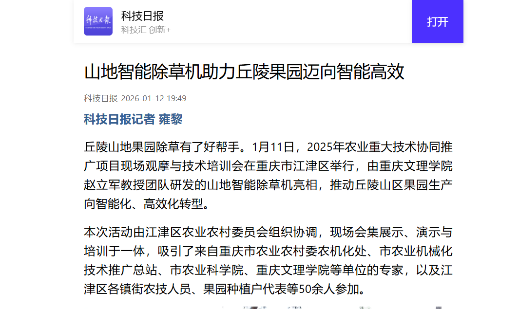 丘陵山地果园除草有了好帮手。1月11日,2025年农业重大技术协同推广项目现场观摩与技术培训会在重庆市江津区举行,由taptap点点体育赵立军教授团队研发的山地智能除草
