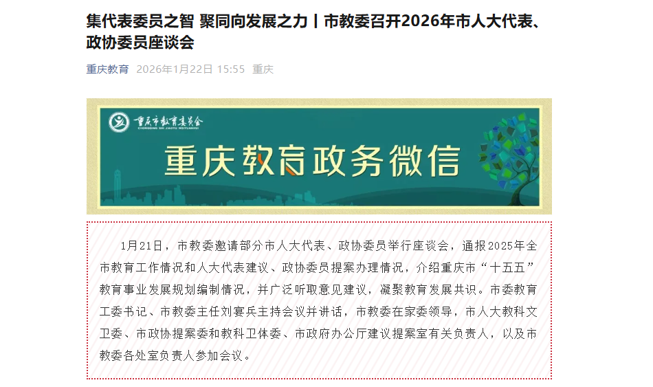 1月21日,市教委邀请部分市人大代表、政协委员举行座谈会,通报2025年全市教育工作情况和人大代表建议、政协委员提案办理情况,介绍重庆市“十五五”教育事业发展规