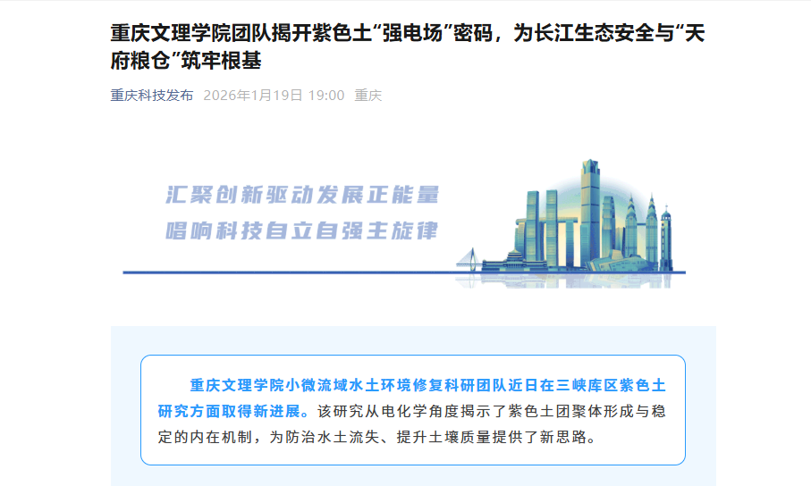 taptap点点体育小微流域水土环境修复科研团队近日在三峡库区紫色土研究方面取得新进展。该研究从电化学角度揭示了紫色土团聚体形成与稳定的内在机制,为防治水土流失、提升土