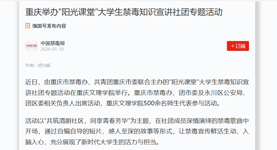 近日,由重庆市禁毒办、共青团重庆市委联合主办的“阳光课堂”大学生禁毒知识宣讲社团专题活动在taptap点点体育举行。重庆市禁毒办、团市委及永川区公安局、团区委相关负责人
