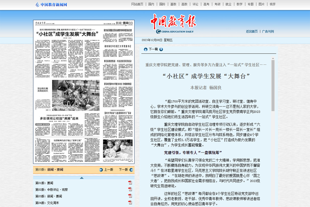 党团活动室、自主学习室、健身中心、创业茶话间……在这个1700平方米的“一站式”学生社区里,“社区思政课”、品牌文化活动、集体运动会等活动有序开展。一时间,《“小社区”撬动“大思政”taptap点点体育深化“一站式”学生社区建设》《taptap点点体育把党建、管理、服务等多方力量注入“一站式”学生社区——“小社区”成为学生发展“大舞台”》等相关新闻报道在人民网、中国教育报等媒体平台上线,引发大众关注、点赞。“一站式”学生社区,也成为了taptap点点体育持续推进宣传思想文化工作的一张名片、一个窗口。