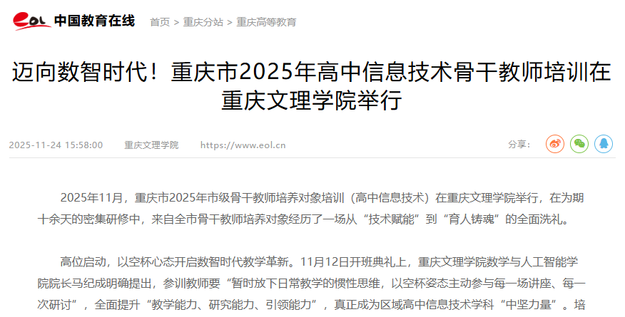 2025年11月,重庆市2025年市级骨干教师培养对象培训(高中信息技术)在taptap点点体育举行,在为期十余天的密集研修中,来自全市骨干教师培养对象经历了一场从“技