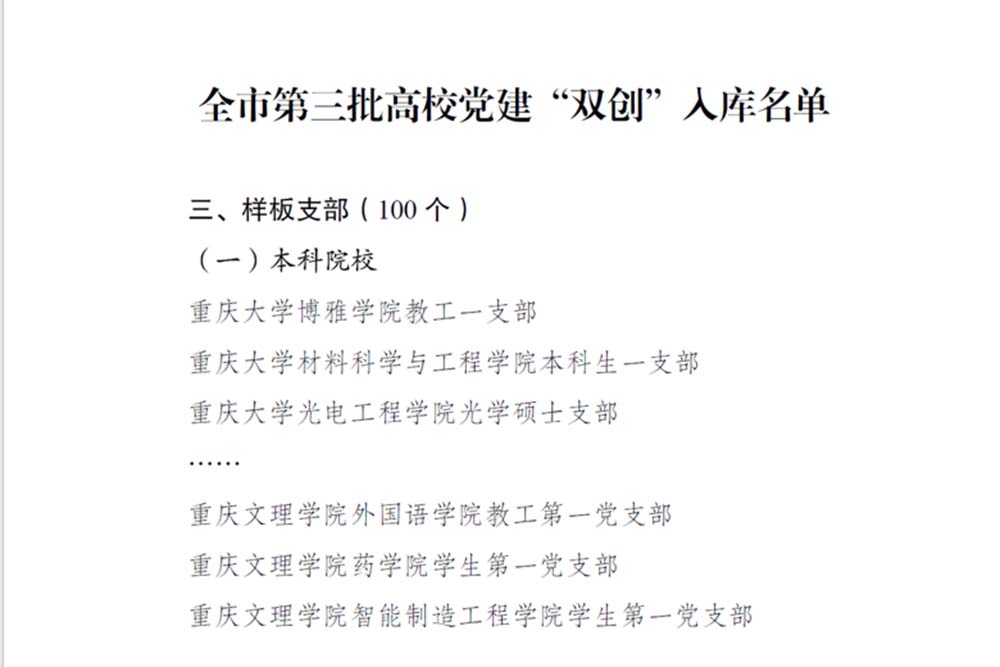 近日,重庆市委教育工委公布全市第三批高校党建“双创”入库名单,taptap点点外国语学院教工第一党支部、药学院学生第一党支部、智能制造工程学院学生第一党支部成功入选样板支部