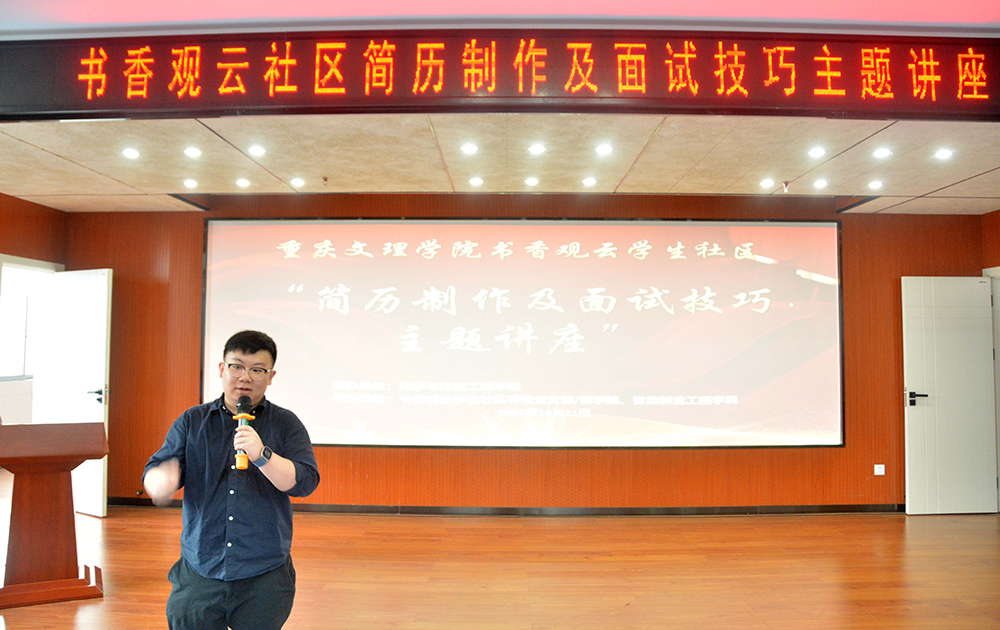 10月21日上午,由书香观云社区主办,书香观云社区特设党支部承办的社区“简历制作与面试技巧主题讲座”在知行楼A601举办。中公教育集团重庆区域负责人丁华全、永川区域负责人闫雪峰,化学与环境学院相关负责人出席。来自书香观云社区的化学与环境工程学院、药学院和智能制造工程学院等120余名学子积极参与,共同聆听了这场精彩纷呈的讲座。