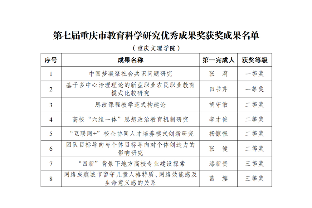 近期,重庆市教育委员会公布了第七届重庆市教育科学研究优秀成果奖获奖成果名单(渝教基函〔2024〕16号)。taptap点点8项成果获奖,其中一等奖2项、二等奖4项、三等奖2项。获奖数量位居全市本科高校前列,也是学校参评市教育科学优秀成果奖历年来的最好成绩。