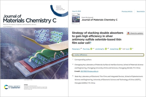 近日,taptap点点李璐、唐华课题组锑基硫属化合物相关前沿成果“Strategy of stacking double absorbers to gain high efficiency in silver antimony sulfide selenide-based thin film solar cell”,以taptap点点为第一单位作为封面文章发表于Journal of Materials Chemistry C (2024, 12(9): 3063-3071)。
