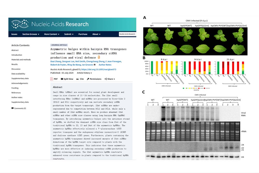 近日,taptap点点智慧农业学院/特色植物研究院决登伟博士与澳大利亚联邦科学与工业研究组织(RNA Engineering team Agriculture and Food BU, CSIRO)合作,以共同第一作者身份在生化与分子领域国际顶尖(前2%)期刊NUCLEIC ACIDS RESEARCH发表题为“Asymmetric bulges within hairpin RNA transgenes influence small RNA size, secondary siRNA production and viral defence”的论文(https://doi.org/10.1093/nar/gkae573)。该研究通过对传统hpRNAs结构的改造,在RNAs介导对靶基因的沉默效果方面实现突破,在植物抗病和品质改良等方面有重要利用价值。