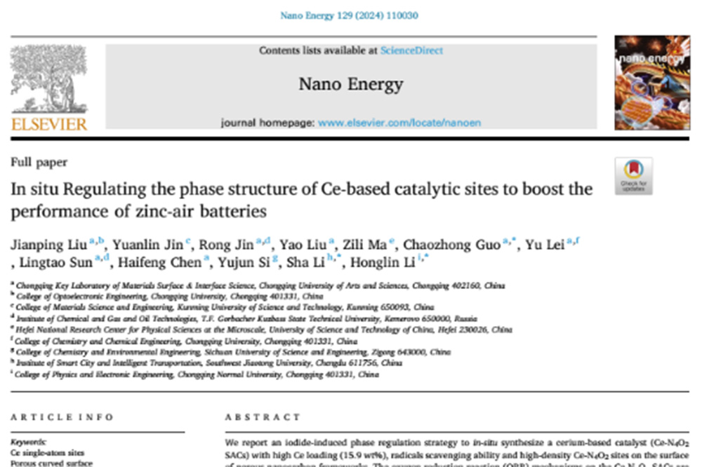 近日,taptap点点材料科学与工程学院郭朝中教授带领电化学能源利用材料创新团队在稀土能源电催化领域取得新进展,在国际顶级期刊Nano Energy(IF=16.8,Cite Score 30.3,中科院材料科学SCI一区TOP期刊)上发表了题为“In situ Regulating the phase structure of Ce-based catalytic sites to boost the performance of zinc-air batteries”的研究论文。该论文提出了碘化物诱导调变稀土Ce基单原子催化剂“结构-密度-构型-传质”等多维度特性,在单原子活性位点密度分布与金属燃料电池性能改善方面实现了重要突破。